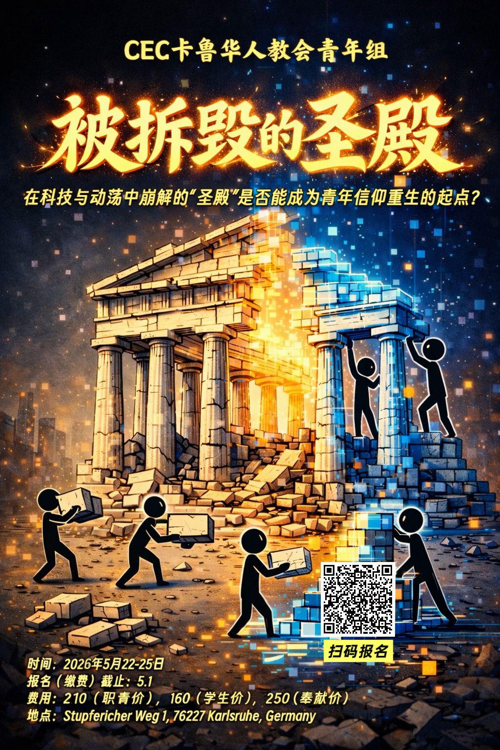 2026 卡鲁青年组营会 - 被拆毁的圣殿 被拆毁的圣殿🌍 — 在崩塌之中,重建你真正的生命🔥这个世界转得太快⏩,我们总忙着赶路,用没完没了的忙碌盖住心里的空洞,靠刷手机、找娱乐打发满身疲惫📱,却很少停下来,好好问问自己:我心里那座本该安稳的圣殿,还在吗?🤔如果你也在迷茫里找答案💛如果心里那团火还没完全熄灭🔥如果不想再硬撑着过日子,想真真正正地活过来🌱那这个营会,就是为你而来。四天三夜,我们不搞形式主义,只用心相处:坐下来聊些有深度、戳内心的话题📖用温柔的音乐和敬拜,安抚疲惫的灵魂🎶靠轻松的小游戏打破陌生,认识同频的人🎲围着篝火,望着星空,说说藏在心底很久的话🌌这里没有完美的人,只有一群和你一样,有过破碎、却愿意试着重新站起来的年轻人🤍。我们彼此接纳,互相陪伴,一起面对过往的伤痕。要知道,被拆毁从来不是终点,而是重新开始的契机🌿 营会信息📅时间:2026年5月22日-25日📍地点:Stupfericher Weg 1, 76227, Karlsruhe, Deutschland 📲扫码即可报名,加入我们这趟旅程,或许不是参加一场普通的营会,而是你终于有机会,找回那个走丢了的自己💖